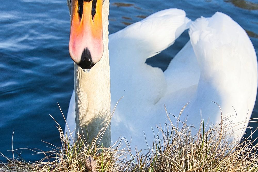 Weißer Schwan, Höckerschwan, auf dem Wasser. Großer Vogel in der Freien Natur
