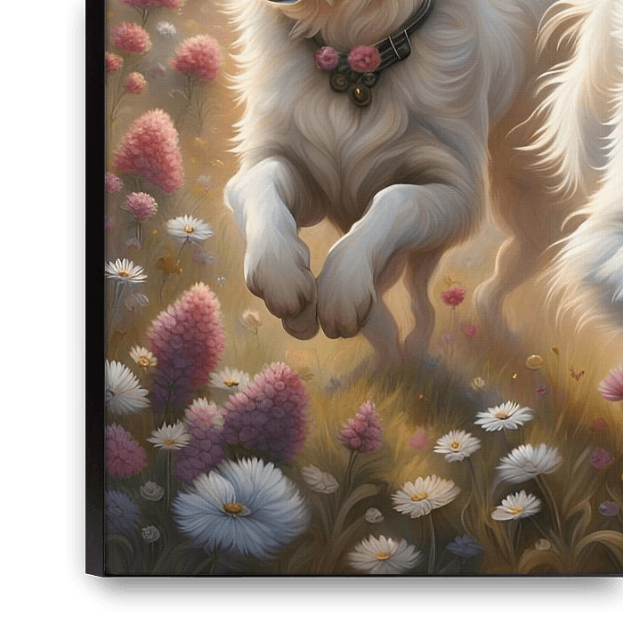 Bestelle das digitale Kunst Bild Weißer Schweizer Schäferhund spielt in einem Blumenfeld 3 von Johannas Art Creations als Reproduktion auf Leinwand, Alu-Dibond, als Poster, Fototapete oder Acrylglasbild.
