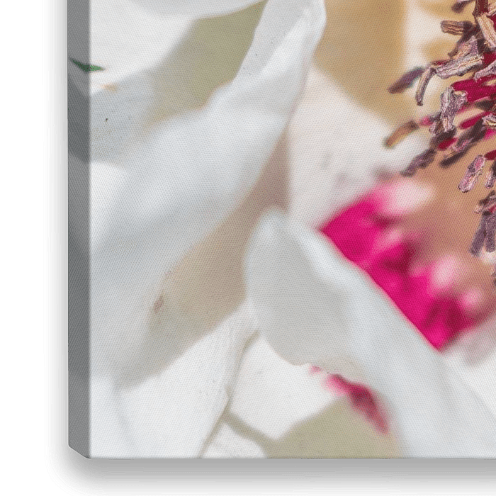 Das Bild zeigt eine Nahaufnahme des Zentrums einer weißen Blüte des orientalischen Mohns (Papaver orientale) der Sorte „Royal Wedding“. Im Fokus steht das detailreiche Innere der Blume: ein komplexes Zusammenspiel aus dunklem Purpur, Rosa- und Rottönen, das sich kontrastreich vom weißen Blütenkranz abhebt. Die zarten, leicht gewellten…
