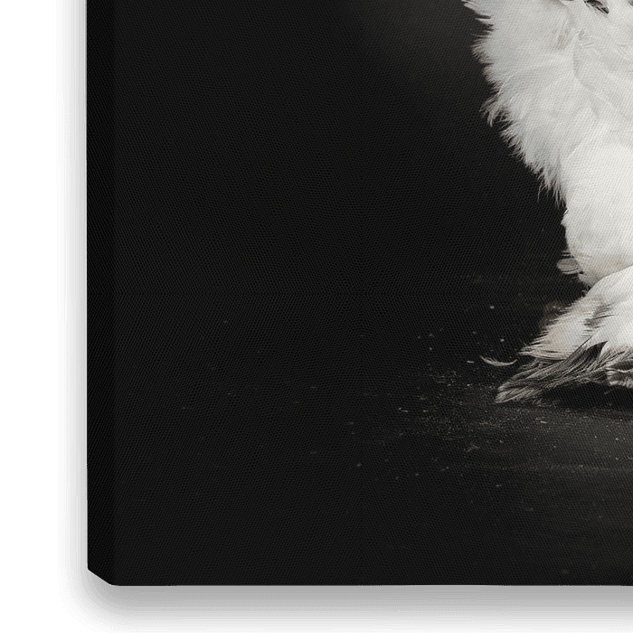 Bestelle dieses Vögel Wandbild Weißes Hühnerfoto auf schwarzem Hintergrund von Florence Schmit als Reproduktion auf Leinwand, Alu-Dibond, als Poster, Fototapete, ArtFrame oder Acrylglasbild, maßgefertigt in höchster Qualität.