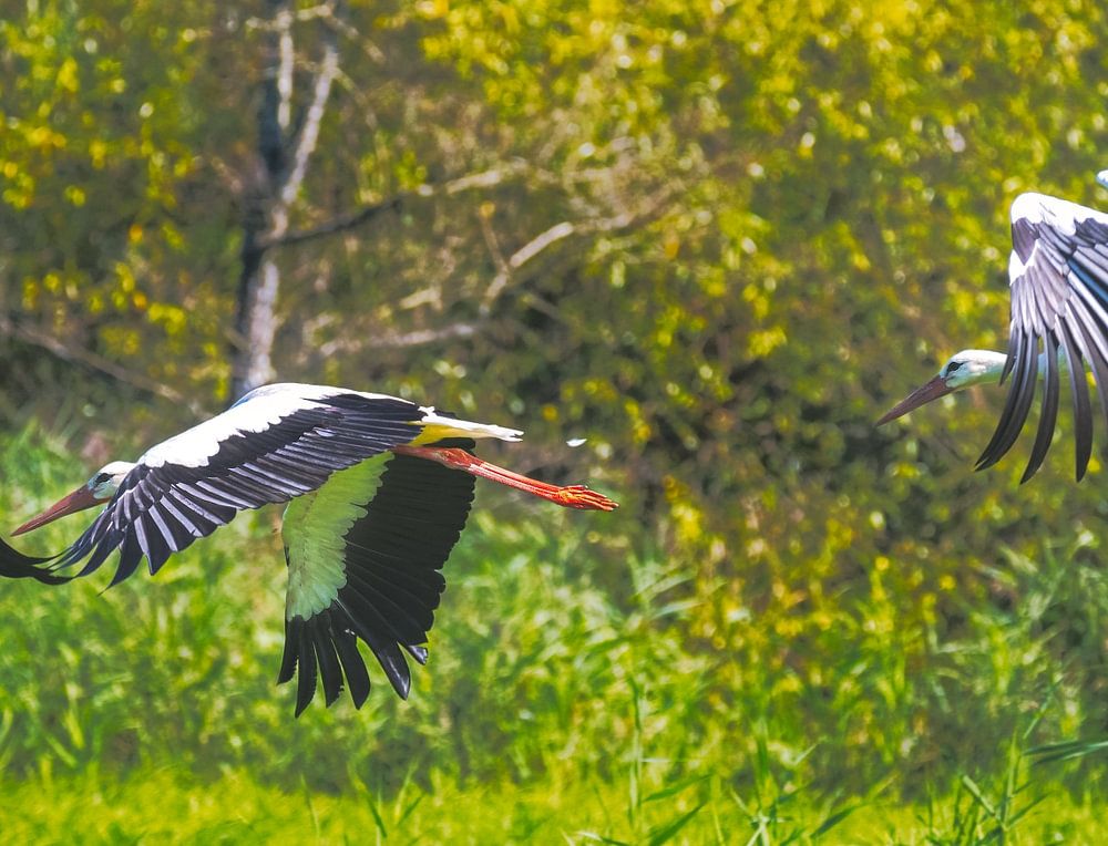 Weißstörche fliegen über einem Feld