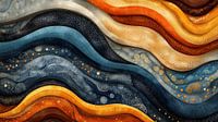 Wellen | Blau-Orange-Welle – Dies ist ein abstraktes Gemälde mit breiten, wellenförmigen Streifen in Erdtönen und Cremefarben, abwechselnd mit tiefblauen und orange-goldenen Schichten sowie feinen Punkten und Texturen – ein abstraktes Gemälde, das vor allem Wellen und Textur zeigt.