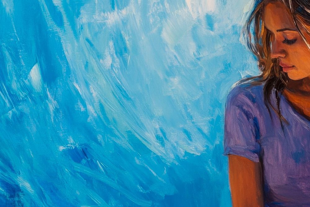 Inmitten eines sanften Ozeans aus Blau und Weiß, verkörpert die junge Frau eine stille Melancholie. Ihr abwesender Blick und die sanften Wellen hinter ihr spiegeln innere Gedanken wider. Die zarte Lichtreflexion auf ihrem Haar lässt die Atmosphäre träumerisch erscheinen und verleiht der Szene eine fast hypnotische Tiefe.