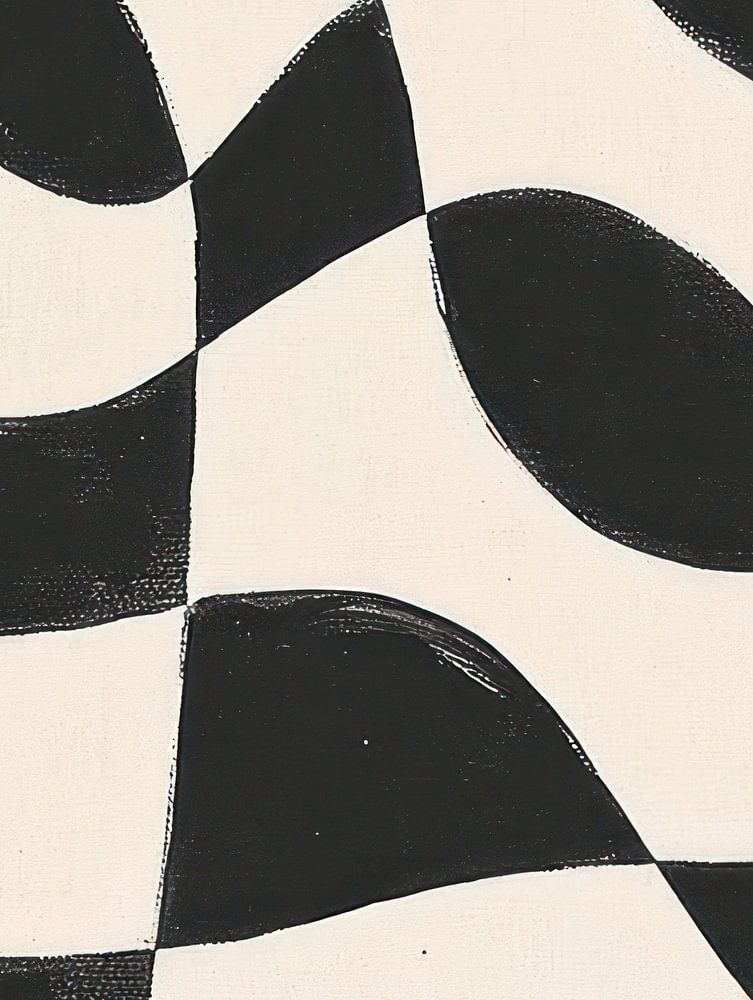 Ein kraftvolles und minimalistisches abstraktes Kunstwerk, das mit dem Gleichgewicht zwischen Ordnung und Chaos spielt. Die fließenden schwarzen Linien und Schachbrettmuster erzeugen einen dynamischen, schachbrettartigen Effekt, während die weichen Pinselstriche dem Bild ein handwerkliches, fast organisches Aussehen verleihen. Das Wechselspiel zwischen starrer Geometrie und freien Formen erzeugt eine visuelle Spannung, die sowohl beruhigend als auch faszinierend ist.
