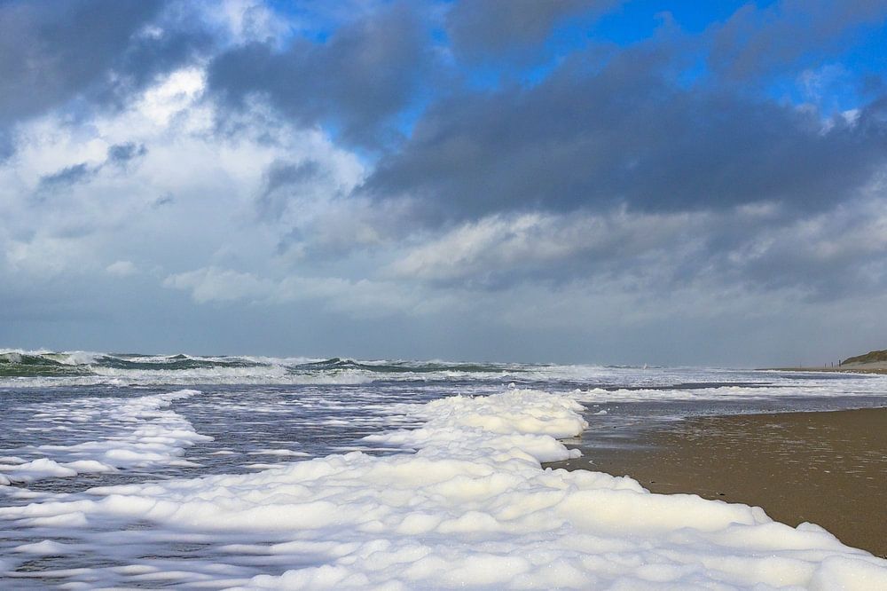 Nordseewellen, die an einem stürmischen Herbsttag auf den Strand der Insel Texel im Wattenmeergebiet im Norden der Niederlande treffen.