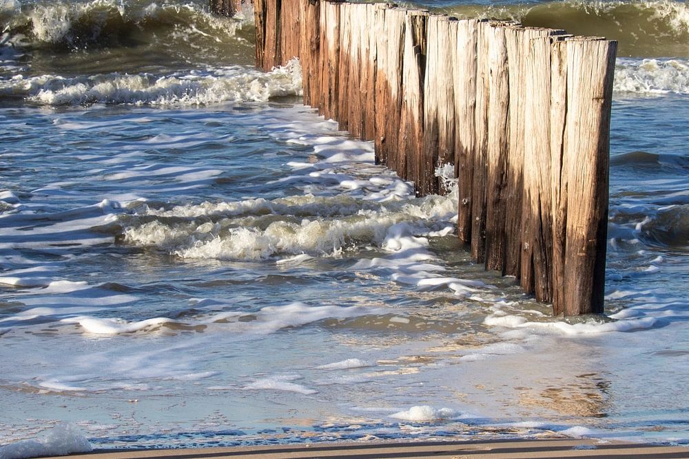 Ein sehr niederländisches Bild: die Wellenbrecher von Domburg. Die tief stehende Sonne warf schöne Schatten und die Wellen hatten feine Schaumköpfe. Die Schaumköpfe lagen auf dem Sand und Möwen flogen hin und her.