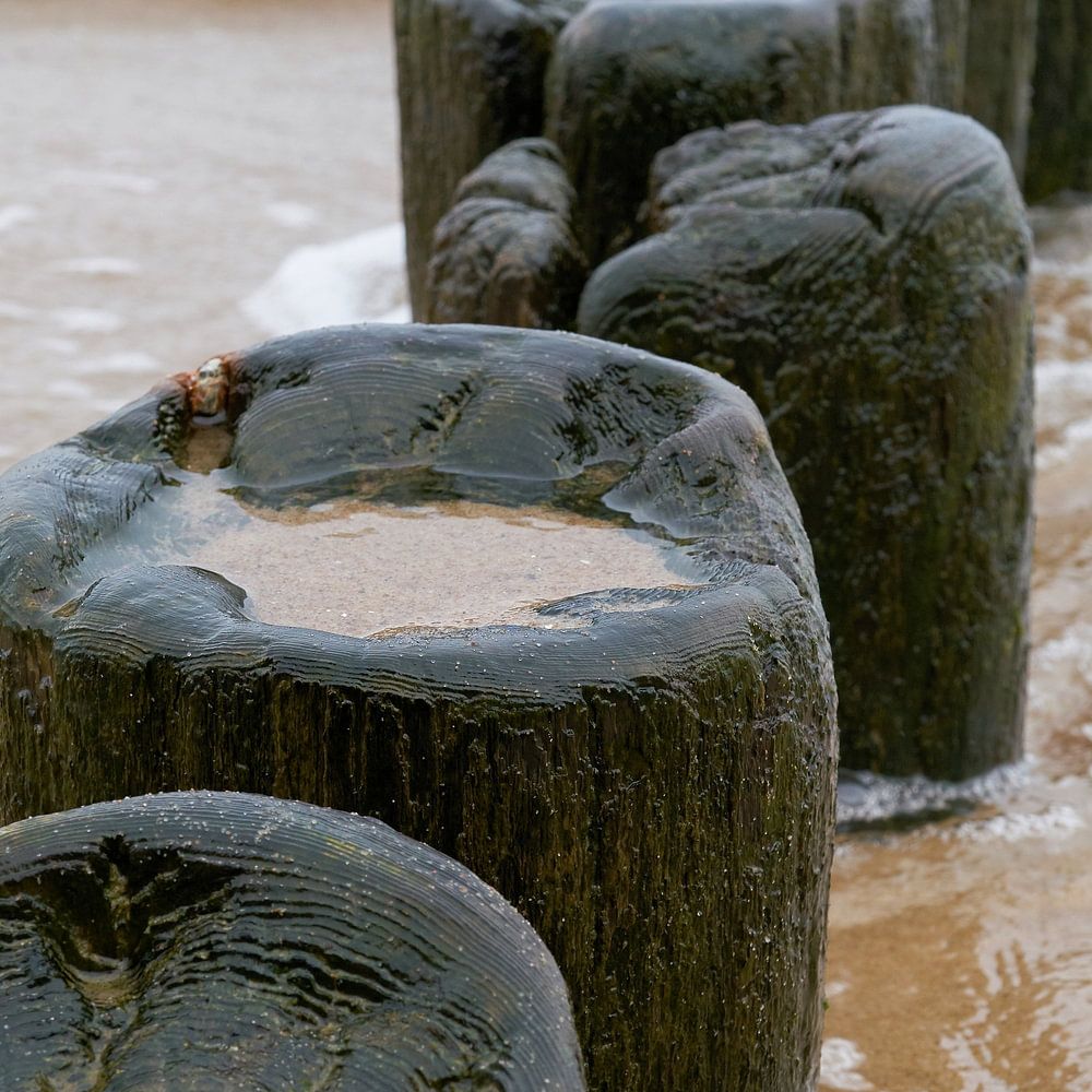 Wellenbrecher am Strand der Ostsee bei Rewal in Polen