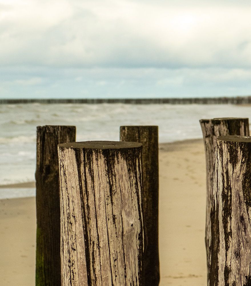 Landschaft mit Meer und verwitterten Wellenbrechern bei Haamstede, Zeeland.
