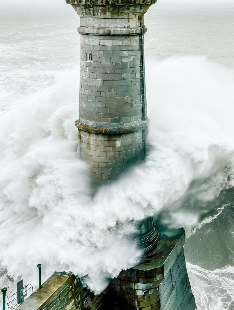 Der Kontrast zwischen dem tiefen Grau des Himmels und dem intensiven Weiß der Wellen verstärkt das Gefühl der Dramatik, das diese Szene ausstrahlt. Die geballte Energie des Ozeans und die Ruhe des Turms schaffen eine faszinierende Spannung. Dieses Bild fängt die Essenz von Stärke und Ausdauer ein, ein Denkmal an die Unbeugsamkeit der menschlichen Errungenschaften gegenüber den unbändigen Kräften der Natur.