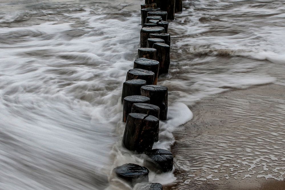 Die für Zeeland typischen Wellenbrecher werden auch Pfahlköpfe genannt und sind ein charakteristisches und fotogenes Bild an der zeeländischen Küste. Eine etwas längere Verschlusszeit zeigt das spielerische Muster der Wellenbewegung um die Pfähle.