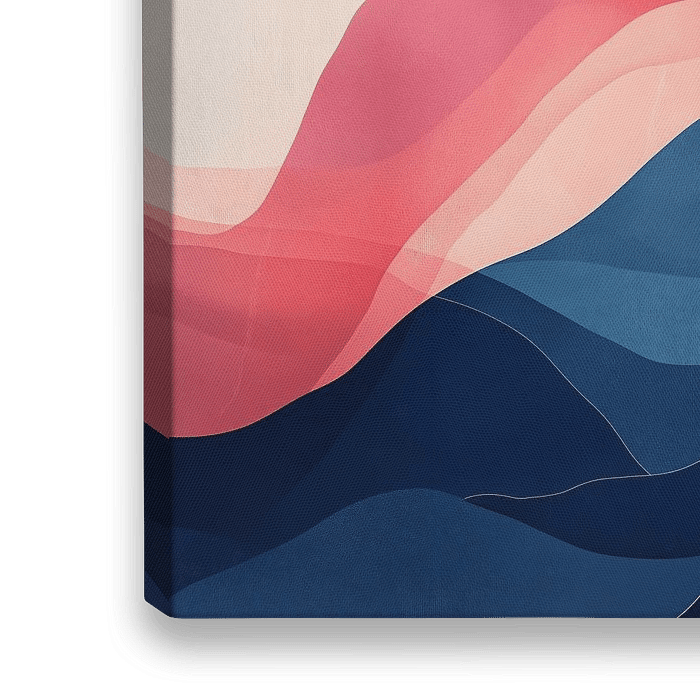 Ein zeitgenössisches abstraktes Kunstwerk, in dem warme Korallenrot- und Pfirsichtöne harmonisch in tiefe Marineblautöne übergehen. Die wellenförmigen, fließenden Linien schaffen eine ruhige Landschaft, die an einen romantischen Sonnenuntergang über einem beruhigenden Ozean erinnert. Die transparenten Schichten verleihen dem Werk eine…
