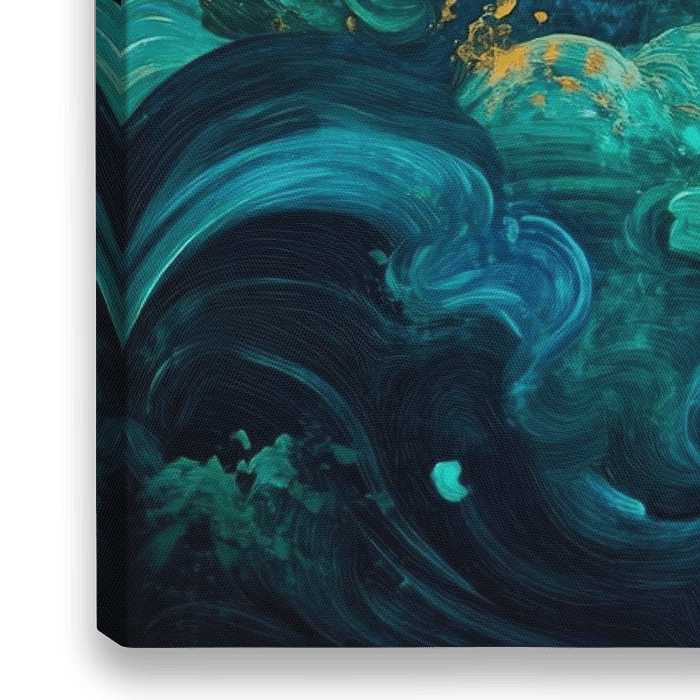 Ein faszinierendes Spiel von kräftigen Wellen und tiefen Blau- und Grüntönen entfaltet sich, während die künstlerischen Strudel fast lebendig wirken. Sanfte goldene Lichtakzente verleihen dem Werk eine mystische Tiefe. Dieses beeindruckende Kunstwerk ist die ideale Ergänzung für ein Wohnzimmer, wo es Aufmerksamkeit und Kreativität anregt.