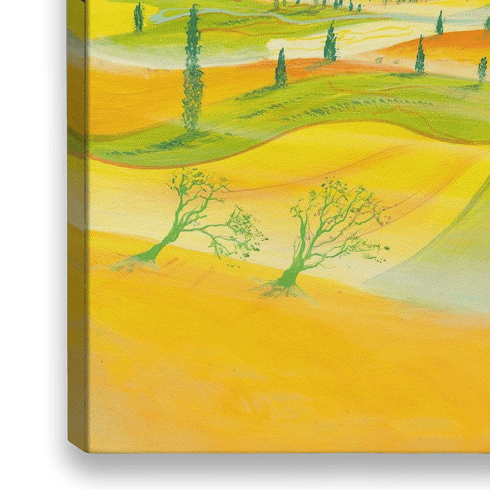 Dieses Gemälde zeugt von einer bemerkenswerten Verschmelzung von abstrakter Konzeption und gegenständlicher Darstellung. Es fesselt den Betrachter mit einer lebendigen Farbpalette, in der warmes Gelb und sanftes Grün die dominierenden Töne sind. Diese Vielfalt an Farben erweckt die natürliche Welt in all ihrer Pracht und Schönheit zum…
