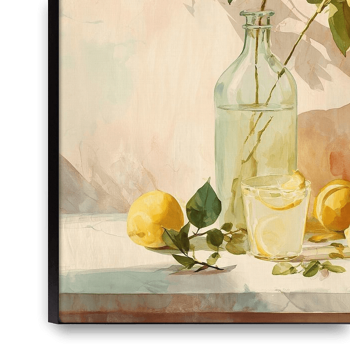 Ein Stillleben mit reifen Zitronen, lose und an Zweigen mit knackigen grünen Blättern. Eine Glasflasche und ein Glas erfrischendes Zitronenwasser schaffen eine mediterrane Atmosphäre vor einem zartrosa Hintergrund. Das Spiel von Licht und Schatten verleiht der Komposition eine ätherische, zeitlose Qualität.