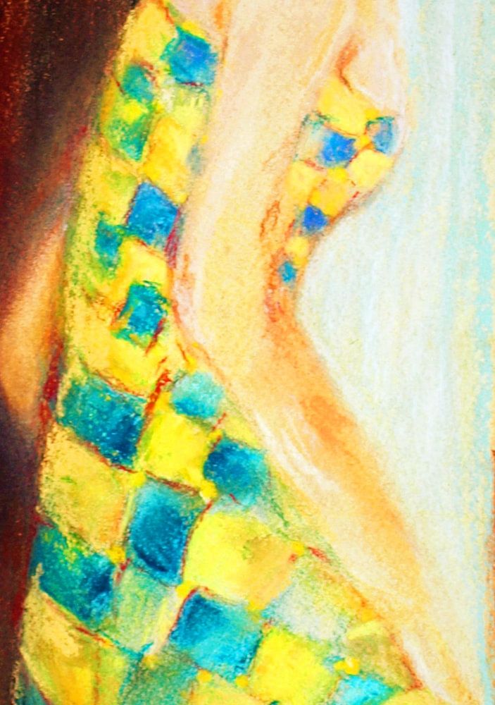 Pastellkreidezeichnung einer Frau, die in der Tür steht, um zu sehen, ob jemand dort steht. Ihr fröhliches gelbes Kleid mit blauen und grünen Blöcken bildet einen schönen Kontrast zu dem dunklen Türrahmen.