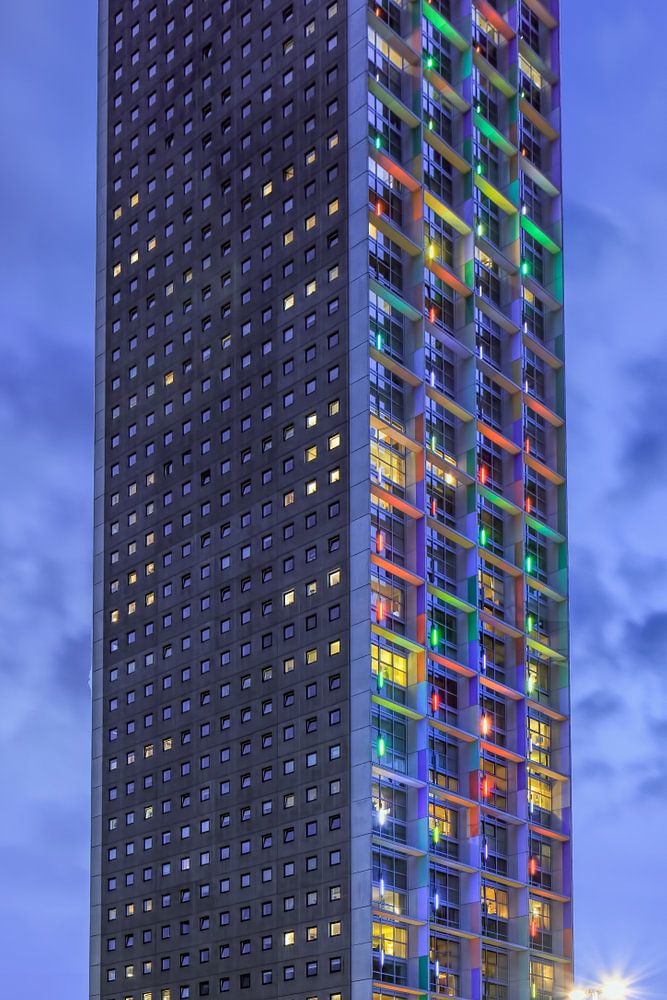 Die 140 Meter beleuchtetes West Point an der Dämmerung, eines der höchsten Wohntürme, Tilburg, Niederlande,