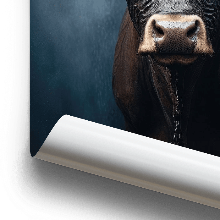 Das Bild zeigt das Rind mit majestätischen Hörnern, das im Regen steht, während dunkelblaugraue Regenwolken den Hintergrund durchdringen. Die Atmosphäre ist durchsetzt von…