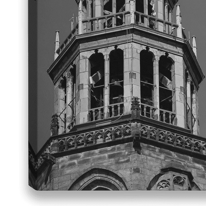 Schwarz-Weiß-Foto vom Gipfel mit dem Wetterhahn des Martini-Turms in Groningen.