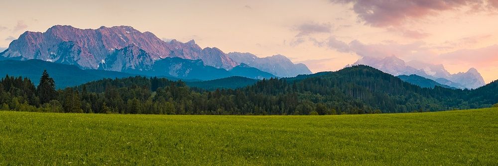 Panorama mit Wettersteingebirge und Zugspitze am Abend im Sommer