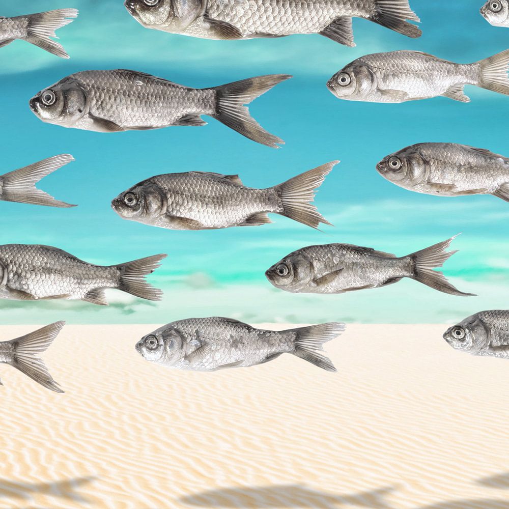 Mit Photoshop erstelltes surrealistisches Werk. Fliegende Fische ohne Flügel werfen ihre Schatten auf die Welt, die sie überfliegen.