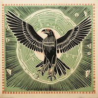 Ein Adler steht mit erhobenen Flügeln in einem blassgrünen Heiligenschein, der von feinen Zeichen und kleinen Glyphen umgeben ist. Die Haltung ist frontal und würdevoll, wobei der Kopf gerade so weit gedreht ist, dass das Profil des Schnabels und ein helles Auge zu sehen sind. Die Federn sind zu entscheidenden Bändern vereinfacht, und…