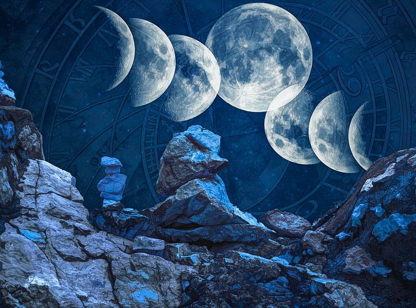 Vor einem sternenklaren Nachthimmel und einer felsigen Kulisse sind verschiedene Mondphasen dargestellt. Das Zusammenspiel von Licht und Schatten erzeugt eine mystische Atmosphäre.