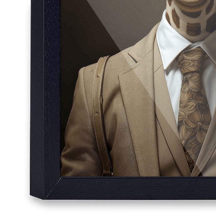 Dieses lustige Kunstporträt zeigt die anmutige Schönheit einer Giraffe, die auch einen Anzug trägt. Dieses Kunstwerk bringt einen Hauch von afrikanischer Wildnis in Ihr Interieur und passt perfekt sowohl in moderne als auch in natürlich inspirierte Dekors. Es strahlt Ruhe und Eleganz aus und ist eine wunderbare Ergänzung für jeden…