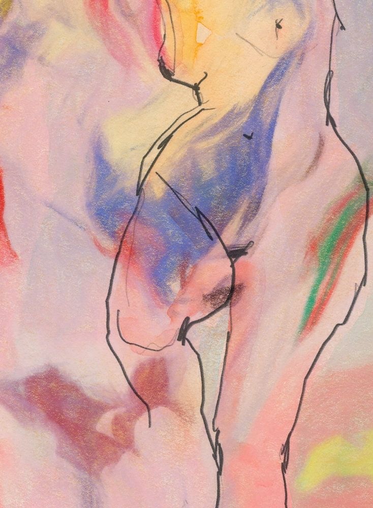 Eine stehende Frau mit ausgestreckten Armen auf einem bunten Hintergrund.