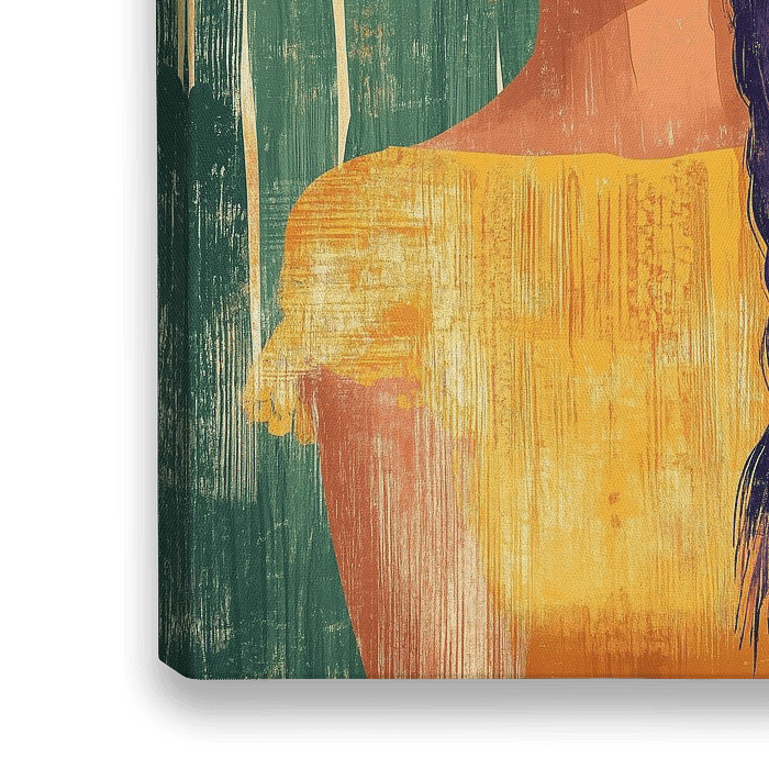 Eine stilvolle künstlerische Illustration mit leuchtenden Farben, die ein Frauenporträt vor einem Hintergrund aus grünen Kakteen zeigt. Das Bild strahlt durch die Verwendung eines gelben Kleides, orangefarbener Blumen und eines lila Haarzopfes Wärme aus. Die Komposition verbindet mexikanische Folkloreelemente mit modernen…