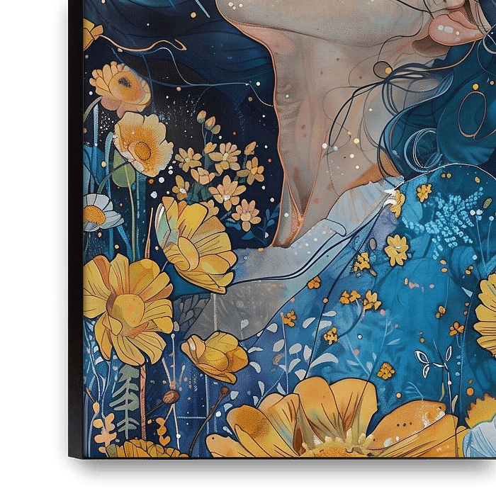 Lassen Sie sich in die traumhafte Welt dieses digitalen Gemäldes entführen. Der ruhige Ausdruck der Frau und die leuchtenden Farben schaffen ein Gefühl der Ruhe und des Staunens.
