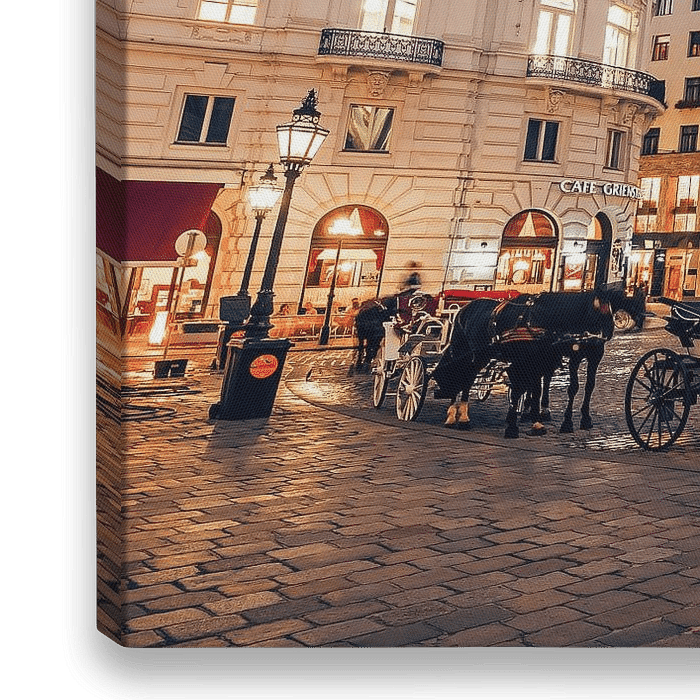 Blaue Stunde an der Wiener Hofburg: Ein Blick auf den Michaelerplatz mit der St. Michael-Kirche und den traditionellen Wiener Fiaker-Kutschen.