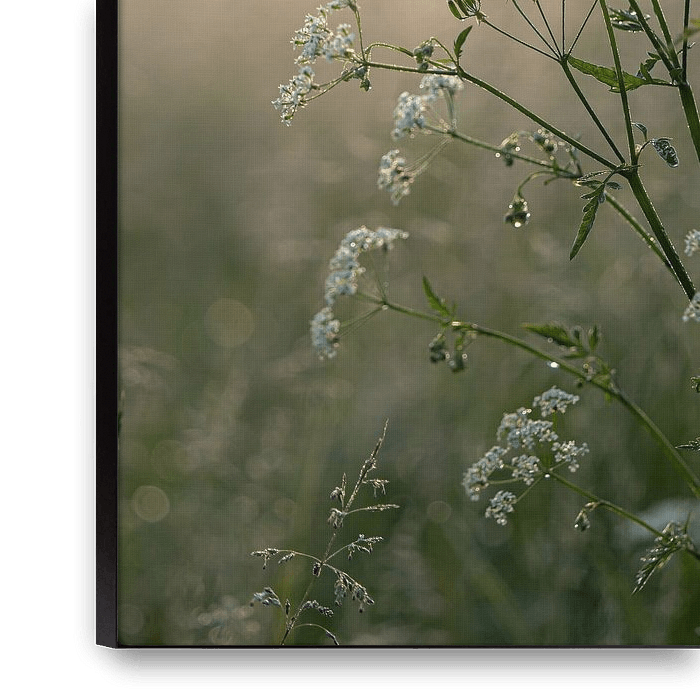 Hübsches Zeug, das Wiesen-Sternmiere – so romantisch im warmen Morgenlicht. Wie ein Stillleben oder ein Gemälde. Toll, das bei leichtem Nebel zu fotografieren. Und schön als Wandbild.