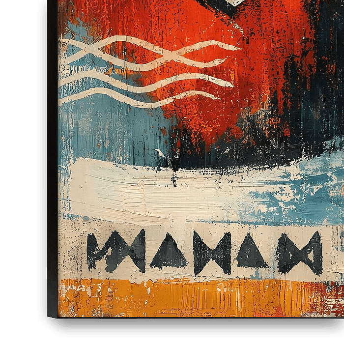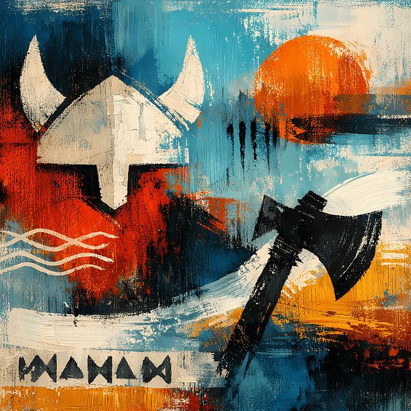 Ein energiegeladenes, abstrakt‑expressives Kunstwerk, das ikonische Wikinger‑Symbole in einer modernen, farbintensiven Bildsprache vereint. Der markante Helm mit Hörnern und die Axt stehen im Zentrum der Komposition, umgeben von dynamischen Pinselstrichen in Blau, Orange, Weiß und Rot. Ein leuchtender Sonnenkreis und angedeutete…