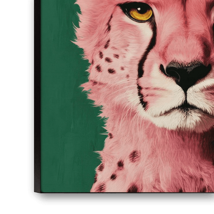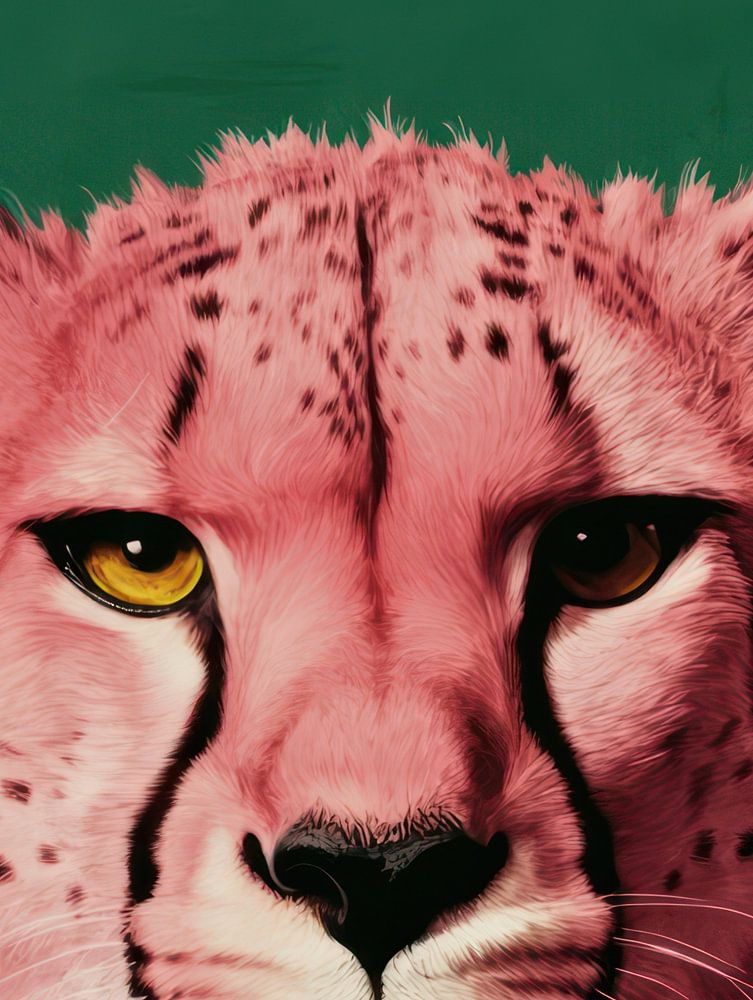 Der intensive Blick des Geparden lädt den Betrachter zu einer stillen Konfrontation ein - ein Moment der Entschleunigung in der flüchtigen Welt. Der grüne Hintergrund unterstreicht die surreale Schönheit des Bildes und bringt die Farbkraft in ein poetisches Gleichgewicht.