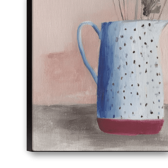 Ein floraler Kunstdruck mit einem lässig gepflückten Feldblumenstrauß in einem hellblauen Krug. Die weichen Pinselstriche und subtilen Farbverläufe verleihen diesem Werk eine warme, ruhige und sehr natürliche Ausstrahlung. Für ein Interieur mit einer poetischen und kreativen Stimmung.