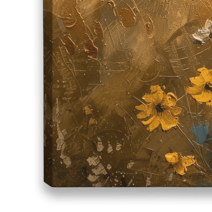 Dieses beruhigende, trendige Gemälde zeigt ein wunderschönes Feld voller Wildblumen, eingetaucht in das goldene Licht des Sonnenuntergangs oder Sonnenaufgangs.