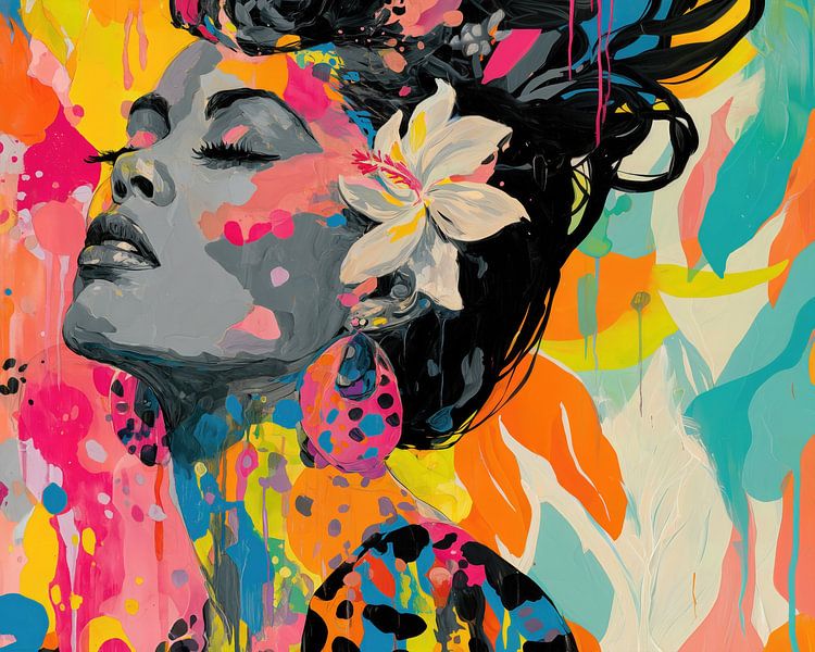 Ein lebendiges zeitgenössisches Porträt einer Frau im Profil, das fließende Pinselstriche, tropische Farbtöne und florale Akzente miteinander verbindet, um ruhige Stärke, Sinnlichkeit und ausdrucksstarke moderne Weiblichkeit zu vermitteln.