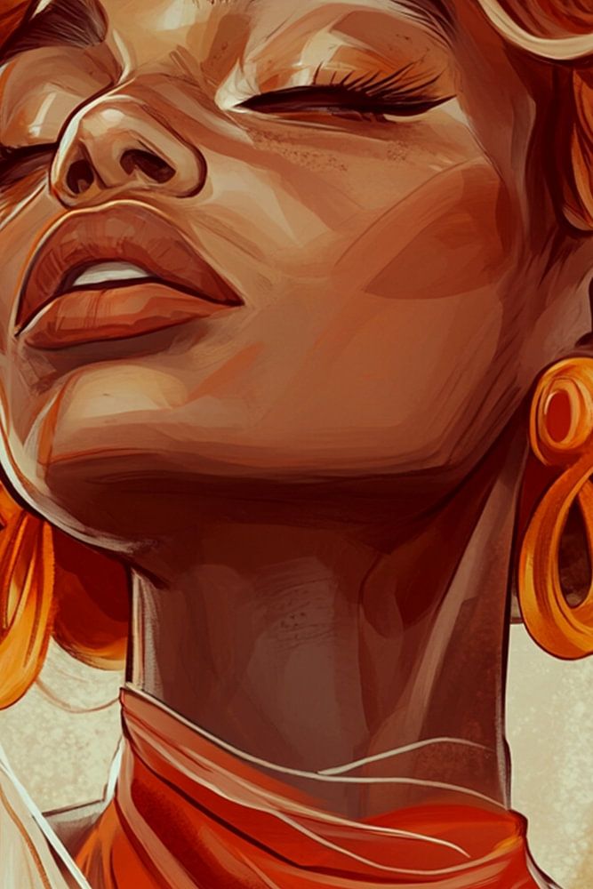 Ein ausdrucksstarkes und sinnliches Porträt einer Frau, die ganz in ihrer Kraft steht. Orange- und Rottöne tanzen wie feurige Bänder um sie herum, während ihre geschlossenen Augen und ihr subtiles Lächeln inneren Frieden und Zuversicht ausstrahlen.