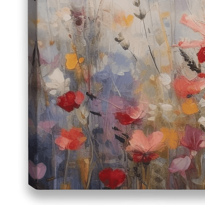 Ein farbenfrohes digitales Gemälde mit einem verträumten, wilden Garten voller Blumen. Das Werk verleiht Ihrem Interieur einen verträumten und klassischen Look!