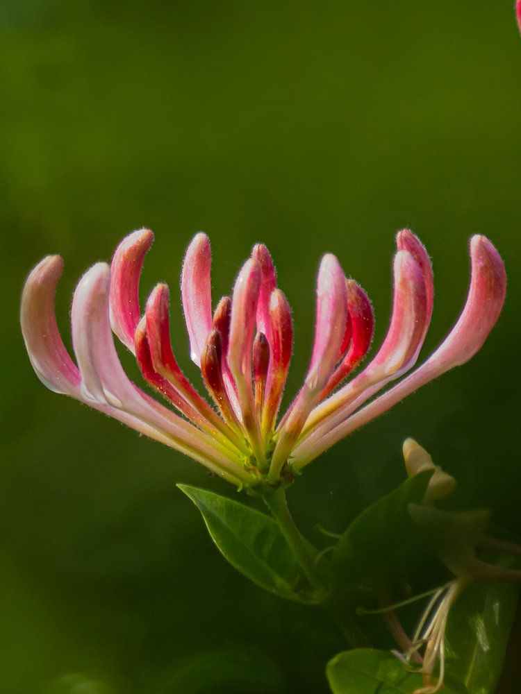 Zwischen den grünen Blättern versteckt, fiel mein Blick auf den blühenden Geißblattstrauch, auf dem auch das Sonnenlicht schön schien.
