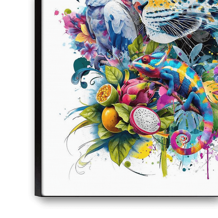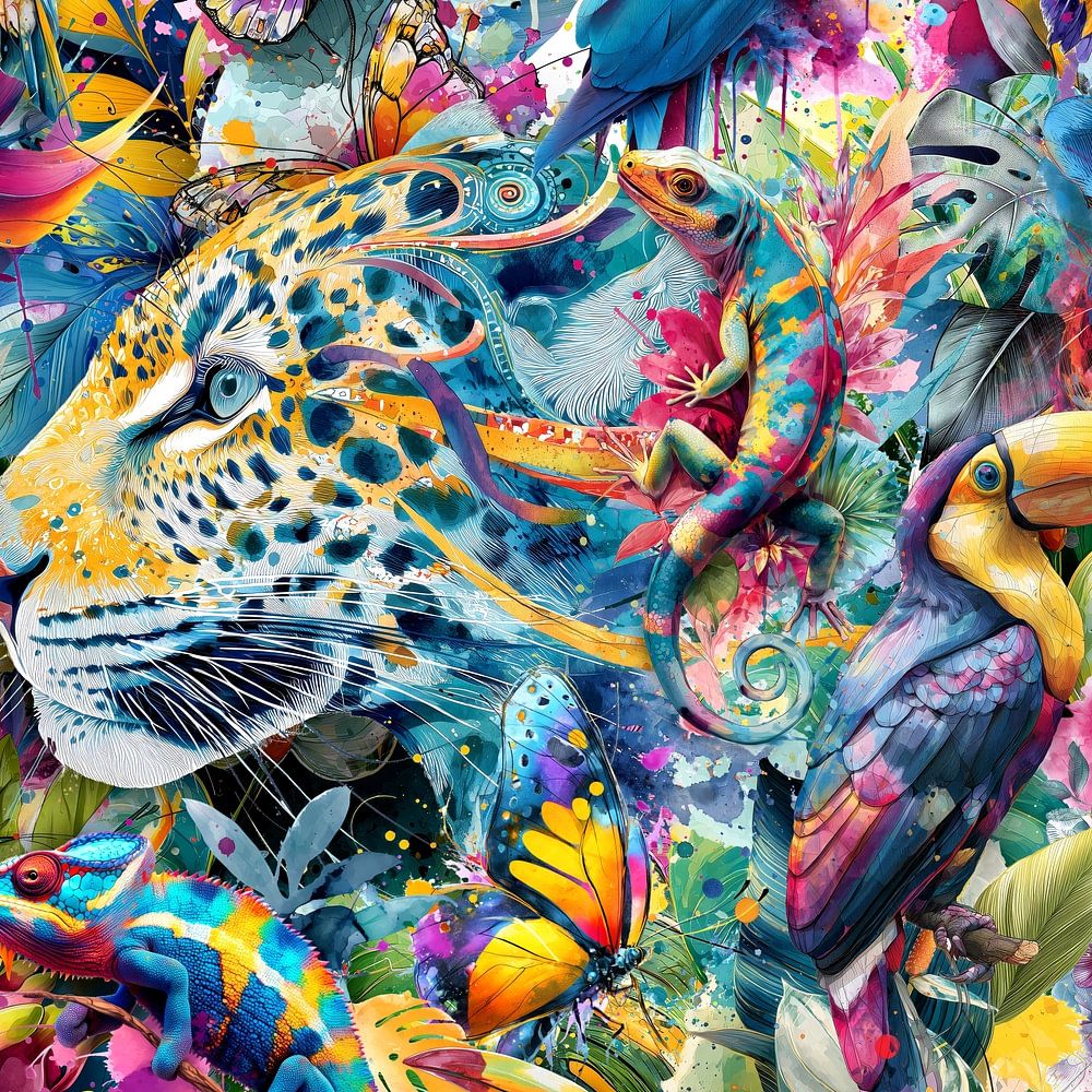 Ein leuchtendes Zusammenspiel aus Tieren und tropischer Blütenpracht – kunstvoll vereint zu einer farbintensiven Collage voller Energie. Jedes Detail erzählt vom Rhythmus des Dschungels und der Magie wilder Natur.