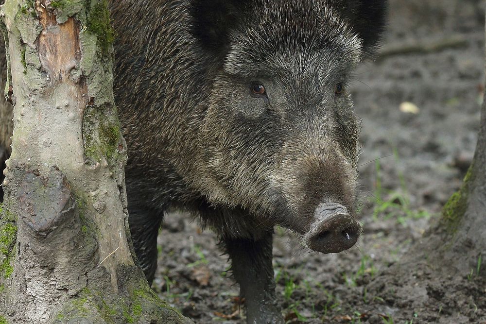 Das Wildschwein (Sus scrofa) ist ein robustes, allesfressendes Säugetier und der wilde Vorfahre des Hausschweins. Das Tier hat einen kräftigen Körperbau, eine kurze Schnauze und ein dichtes, borstiges Fell, das von grau-braun bis schwarz reicht. Ausgewachsene männliche Tiere haben sichtbare Stoßzähne, die als Verteidigungswaffe dienen und bei der Nahrungssuche helfen.