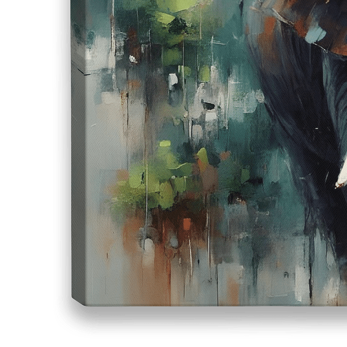 Ein majestätischer Elefant wird mit kräftigen Farben und kühnen Pinselstrichen dargestellt und strahlt eine beeindruckende Präsenz aus. Der Einsatz von Licht und Schatten verleiht den Gesichtszügen des Tieres Tiefe und hebt die komplizierten Details seiner Haut und Stoßzähne hervor.