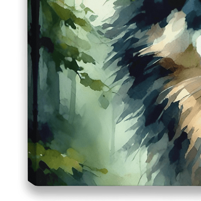 Ein majestätischer Wolf mit scharfen Augen ist vor einem nebligen Waldhintergrund abgebildet. Das Bild wurde mit einem Aquarell-Effekt erstellt, der ihm eine lebendige und doch verträumte Qualität verleiht.