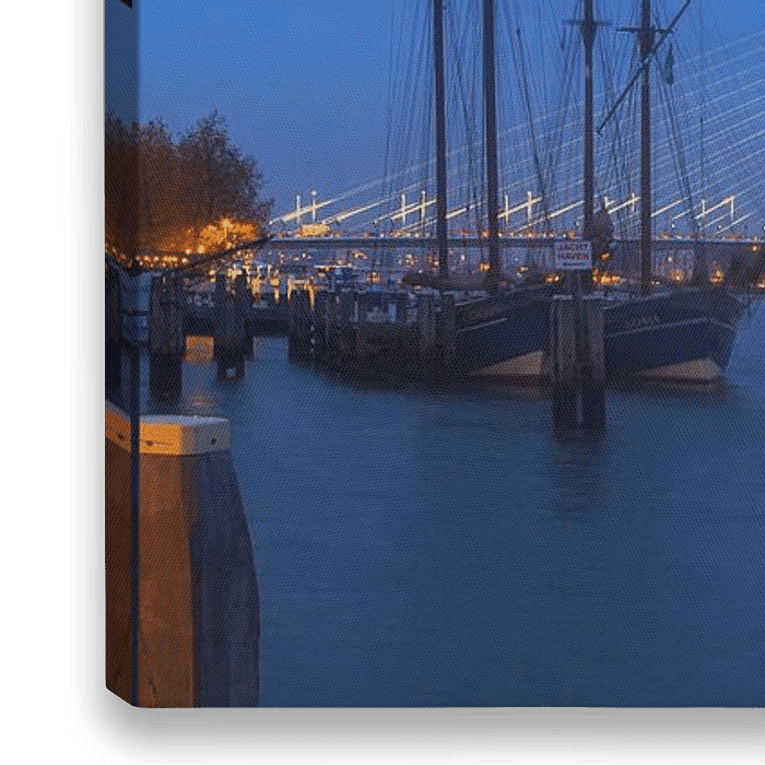 Der Wilhelmina-Pier in Rotterdam, fotografiert von der Spitze des Veerhavens nach Sonnenuntergang. Die Erasmusbrücke ist das Bindeglied zwischen den klassischen Segelschiffen im Veerhaven und der modernen Architektur am Wilhelmina Pier. Dazwischen fließt, wie immer, die Maas.