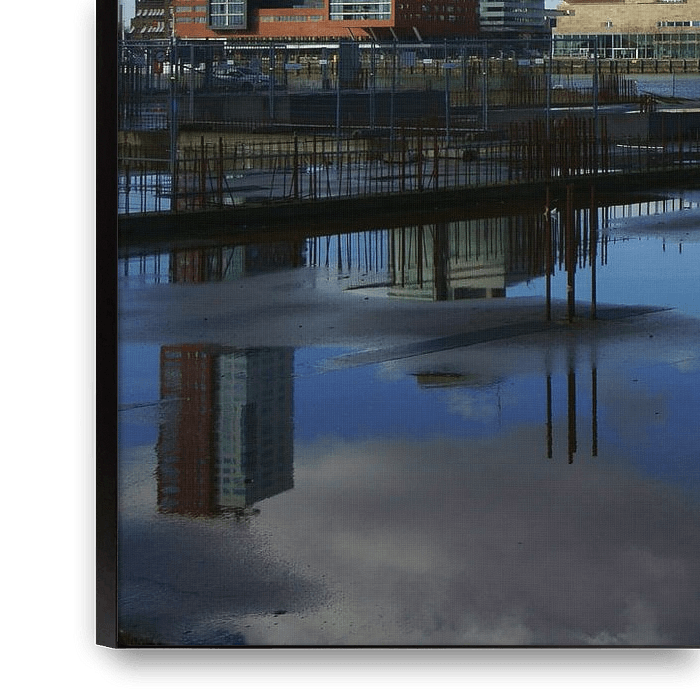 Foto van diverse gebouwen op de Kop van Zuid in Rotterdam, weerspiegeld in plassen op een bouwplaats aan de Rijnhaven op Katendrecht. De rode bakstenen van de Rechtbank Rotterdam kleuren mooi bij de roestige wapening in de fundering op de voorgrond.