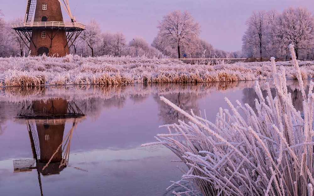 Winterlandschaft im Panoramaformat mit Kornmühle De Juffer an der Hunze - Oude Weer, Hunzedal, Gasselternijveen, Drenthe.