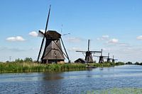 Typisch niederländische Landschaft mit den Windmühlen in Kinderdijk. Dieses Dorf ist Teil der Gemeinde Molenlanden im Ablasserwaard. und liegt in der niederländischen Provinz Südholland.