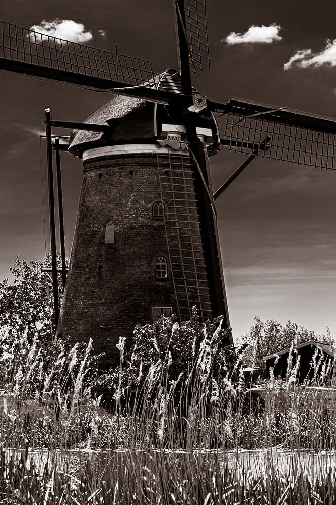 Foto einer Windmühle in Kinderdijk Zwart-wit.