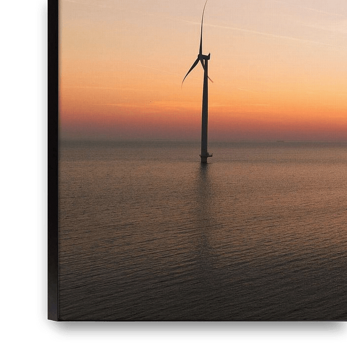 Bestelle das Foto Windturbinen in einem Offshore-Windpark bei Sonnenuntergang von Sjoerd van der Wal Fotografie als Reproduktion auf Leinwand, Alu-Dibond, als Poster, Fototapete oder Acrylglasbild.